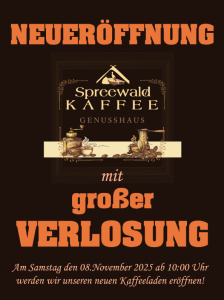 Am 8.11.2025 ab 10:00 eröffnen wir unseren neuen Kaffeeladen in Burg (Spreewald).